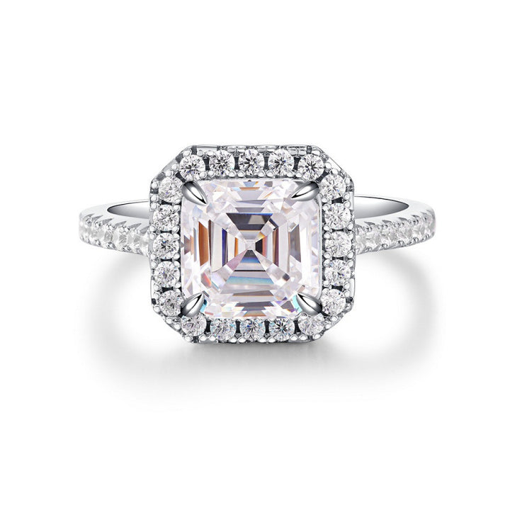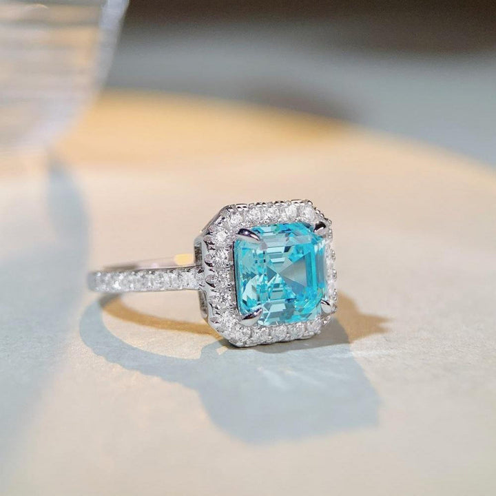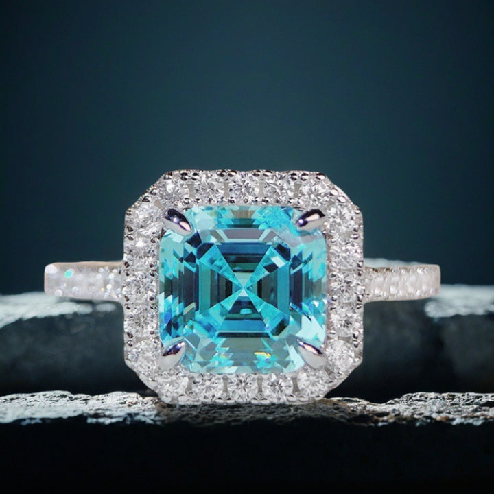 跨境珠宝S925纯银方包满钻戒指女海蓝宝高碳钻锆石宝塔切戒指批发