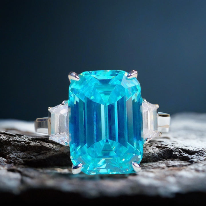 925银戒指大冰糖海蓝宝方形宝塔祖母绿切镀铂金铑金不掉色戒指女