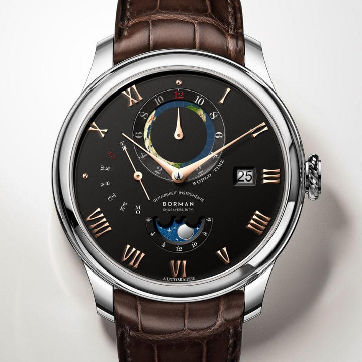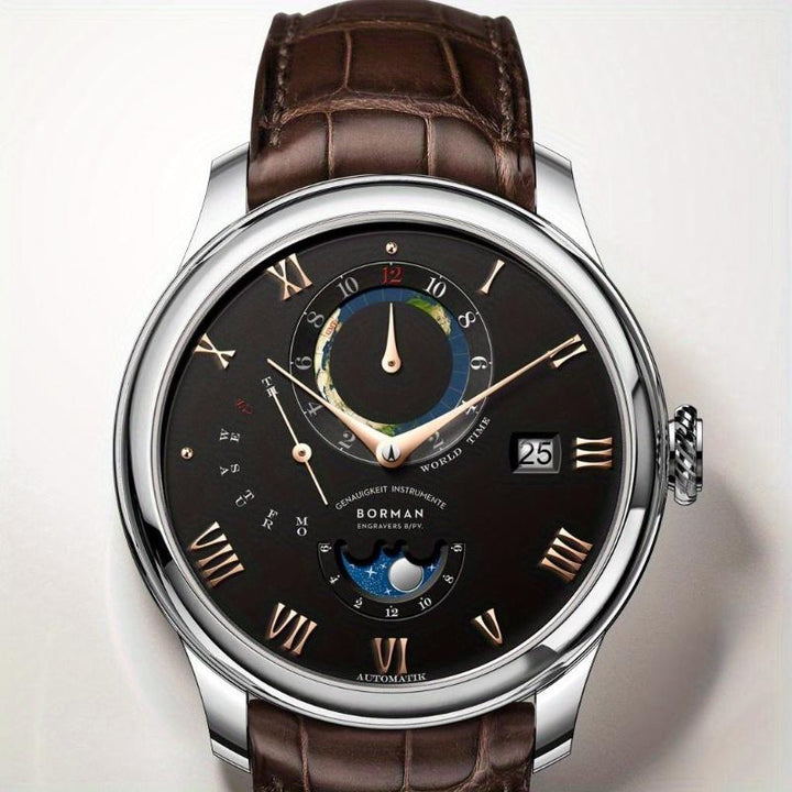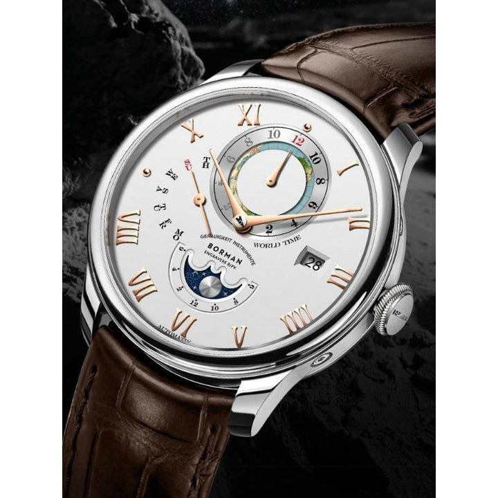 Classic design with complexity. The design of the watch is inspired by the style of the classic revival to the classic complex era. The dial has Roman numerals with a small sub-dial in the center, which may be used to display a second time zone or 24-hour time. There is also the word "WORLD TIME" on the dial, indicating that this watch has a world time function. The case appears to be metallic and the strap is brown leather. The overall design is very sophisticated and high-end.
