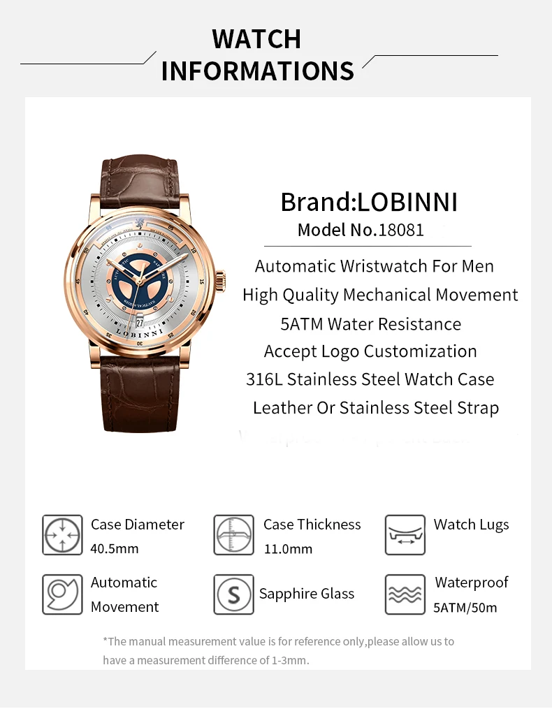 8: How long has this brand been established? A: Our LOBINNI brand watches were established in 1963 with advanced high-tech production facilities and focus on producing high quality watches.