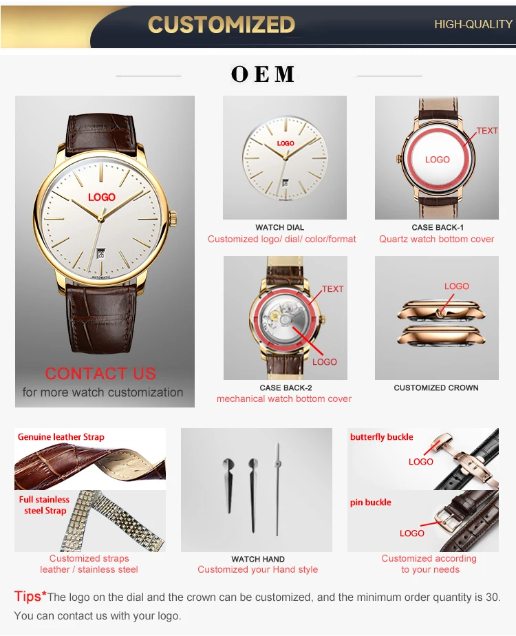 Our company can provide high-end luxury mechanical watches and quartz watches for men and women. Different kinds of materials can be provided according to your requirements: Shell: 316L precision steel shell Watch strap: leather watch strap, stainless steel chain watch strap, stainless steel mesh watch strap Mirror: mineral glass, sapphire glass Movement: We can provide imported movement+Chinese movement according to your requirements