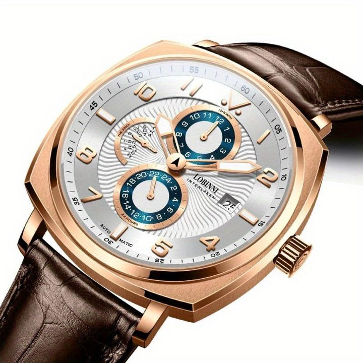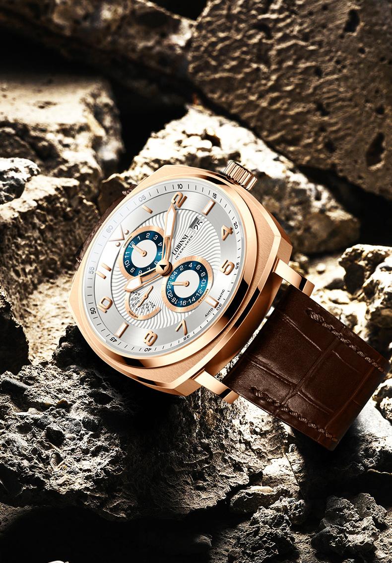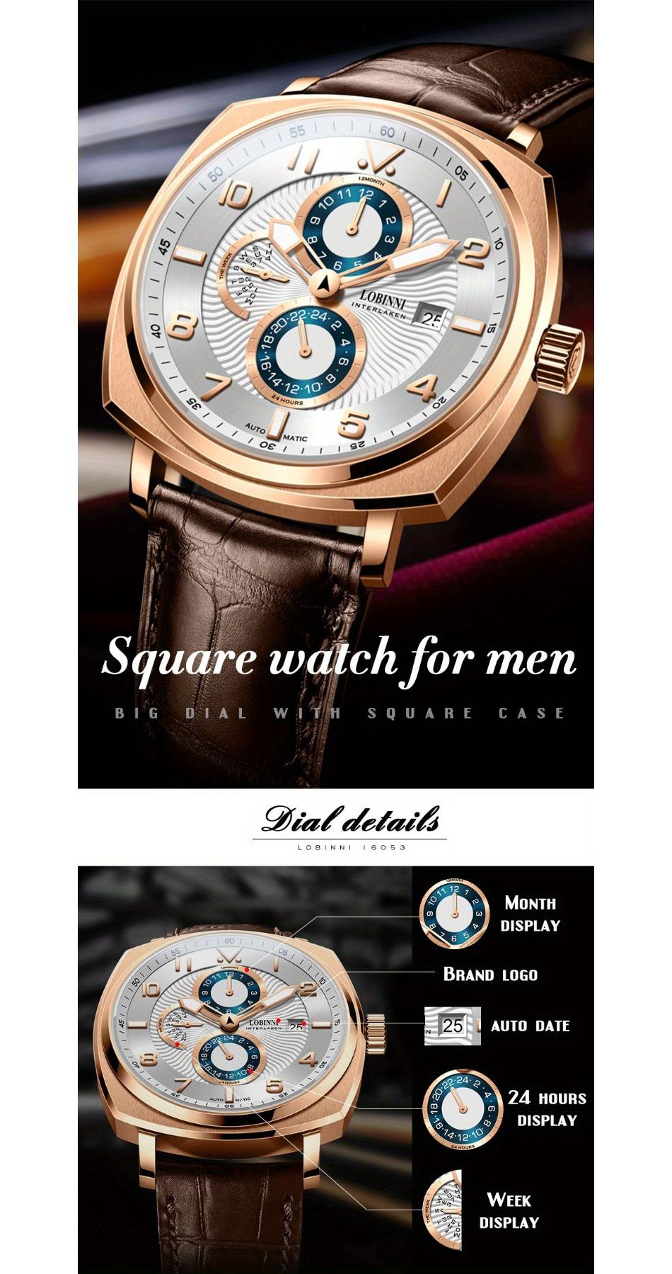 LOBINNI Men's Automatic Mechanical Square Watch, Waterproof, Gentleman Style,Mechanical Watch with Month, Day and Week Display