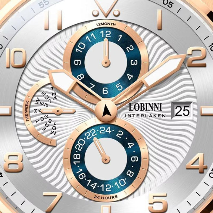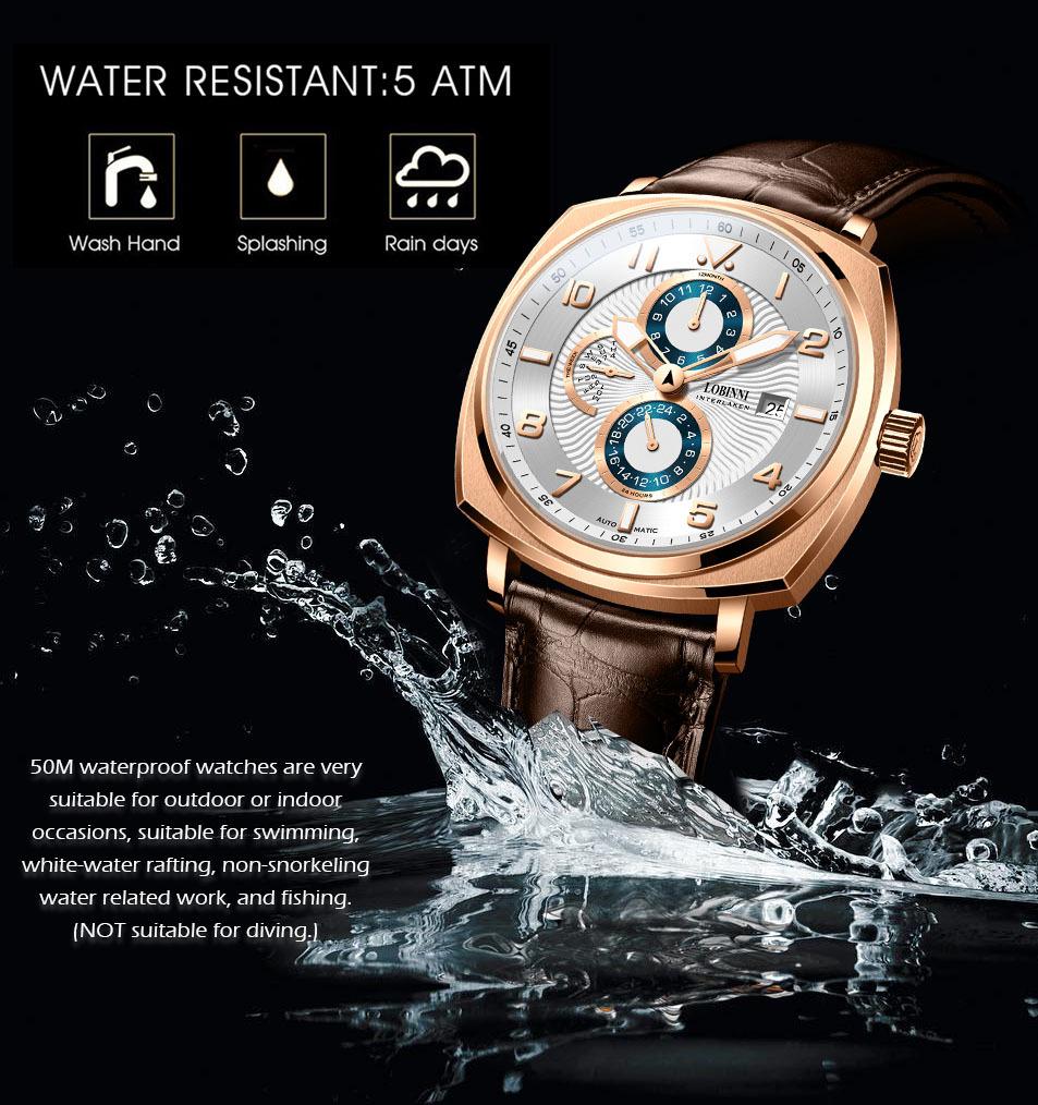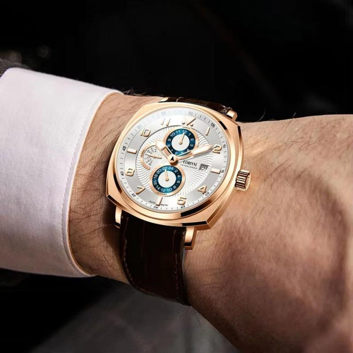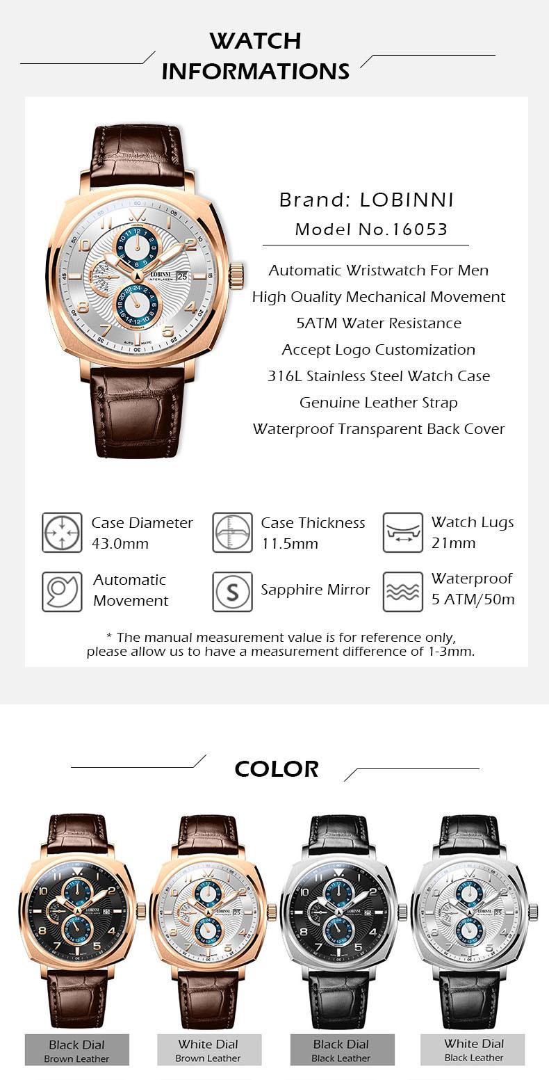LOBINNI Men's Automatic Mechanical Square Watch, Waterproof, Gentleman Style,Mechanical Watch with Month, Day and Week Display