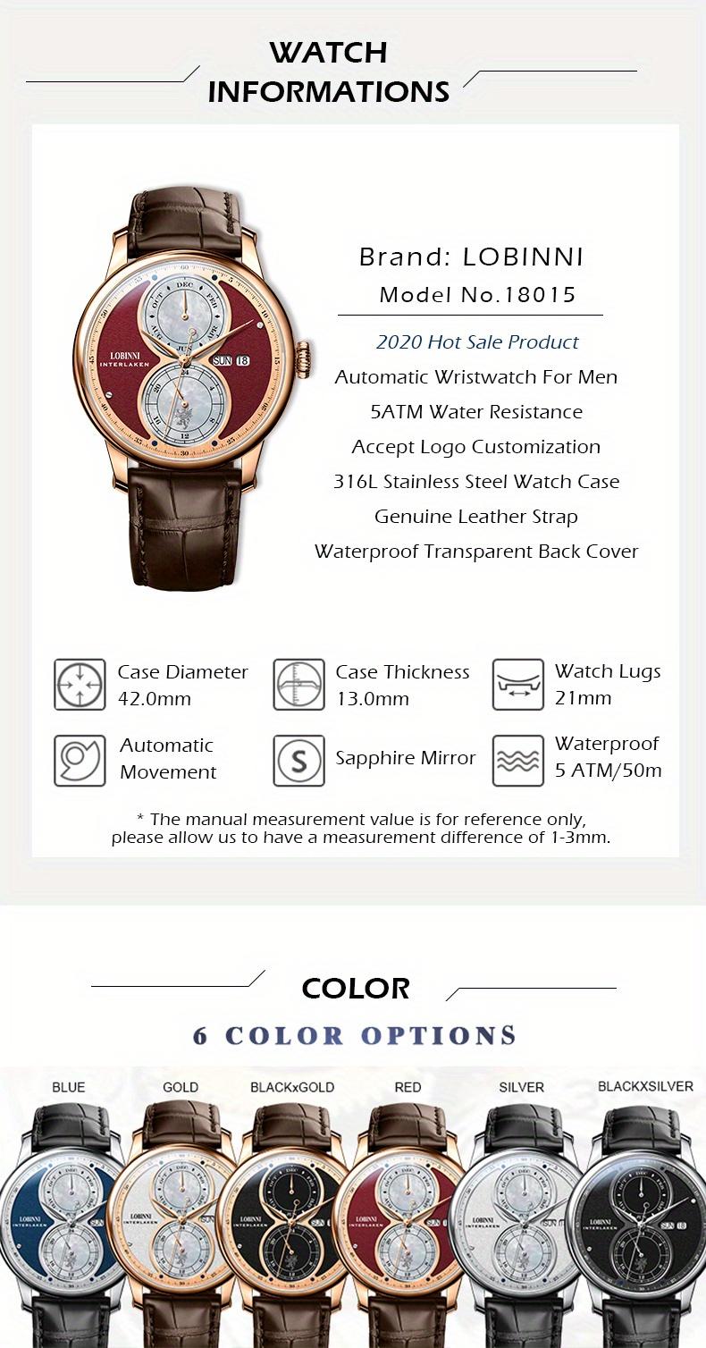 LOBINNI Men's Mechanical Watch, Fully Automatic Waterproof Fashionable Versatile Watch