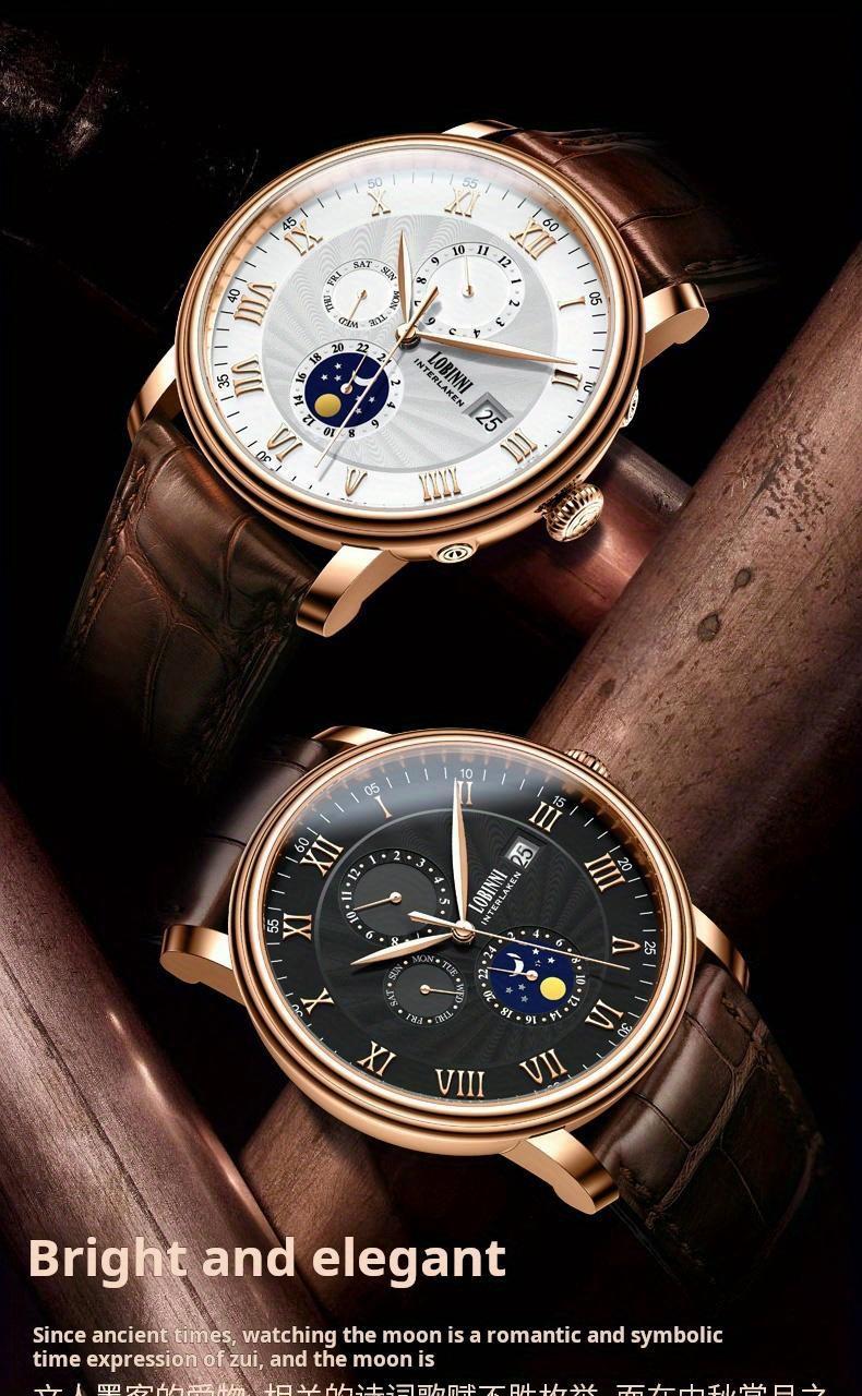 LOBINNI Men's Sleek Business Watch - Automatic Mechanical Movement, Stainless Steel Case & Faux Leather Strap,Mechanical Watch with Day and Week Display