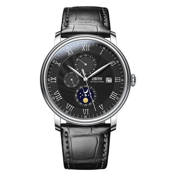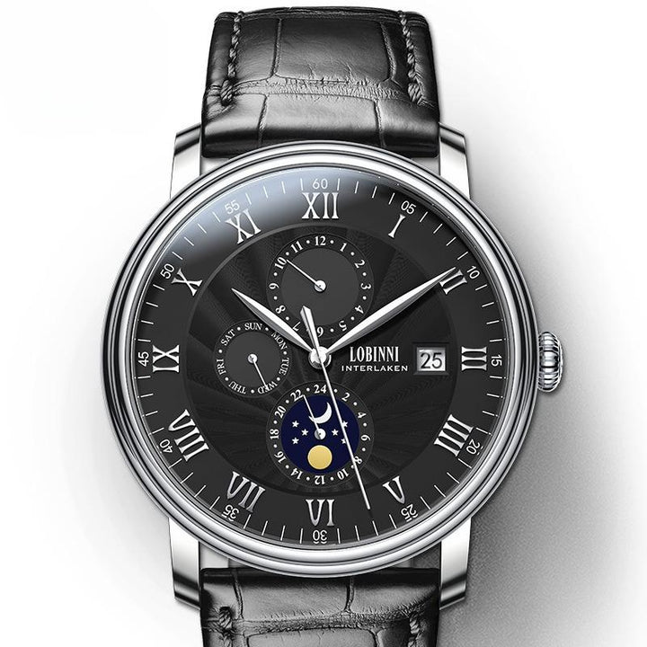 LOBINNI Men's Sleek Business Watch - Automatic Mechanical Movement, Stainless Steel Case & Faux Leather Strap,Mechanical Watch with Day and Week Display