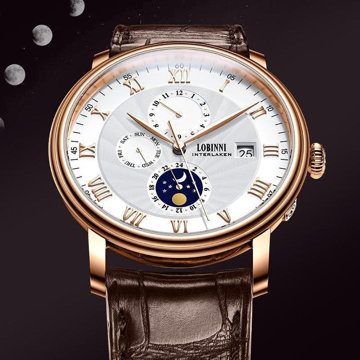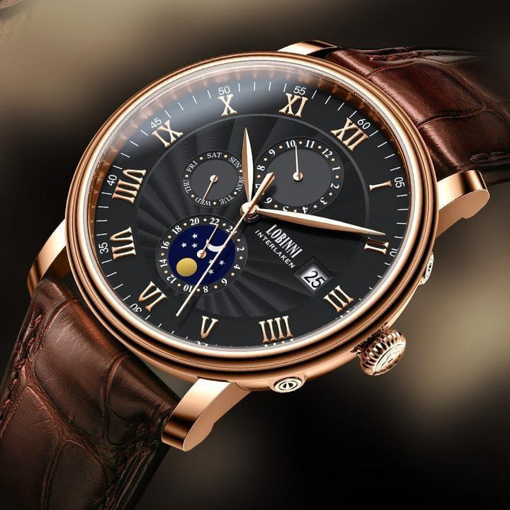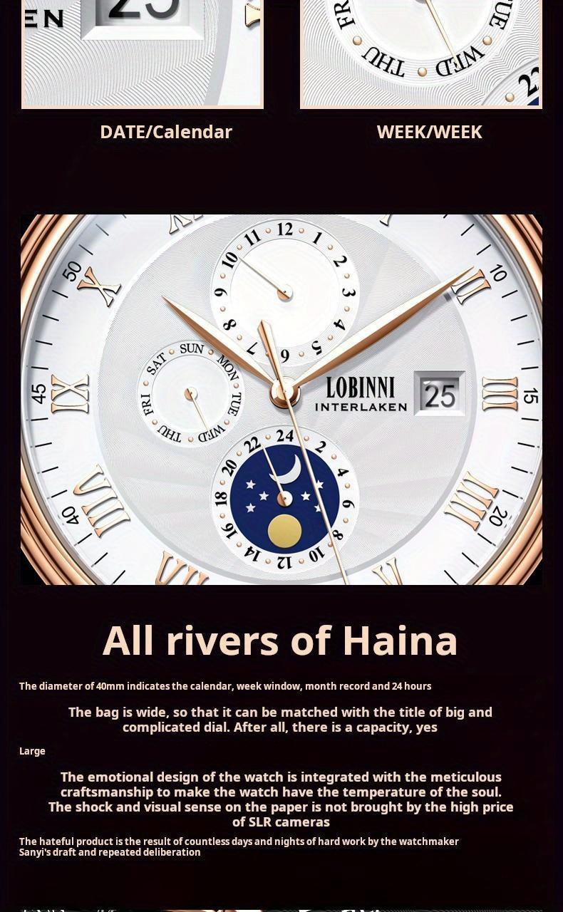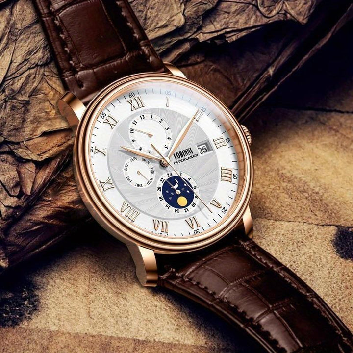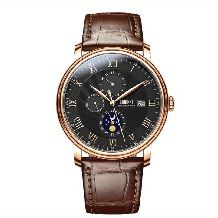 LOBINNI Men's Sleek Business Watch - Automatic Mechanical Movement, Stainless Steel Case & Faux Leather Strap,Mechanical Watch with Day and Week Display