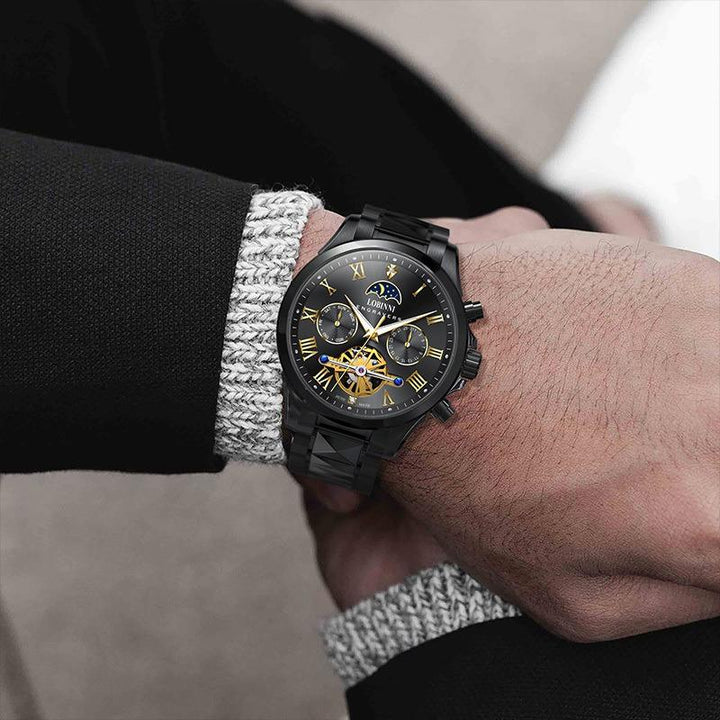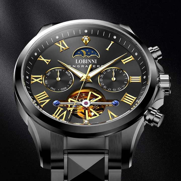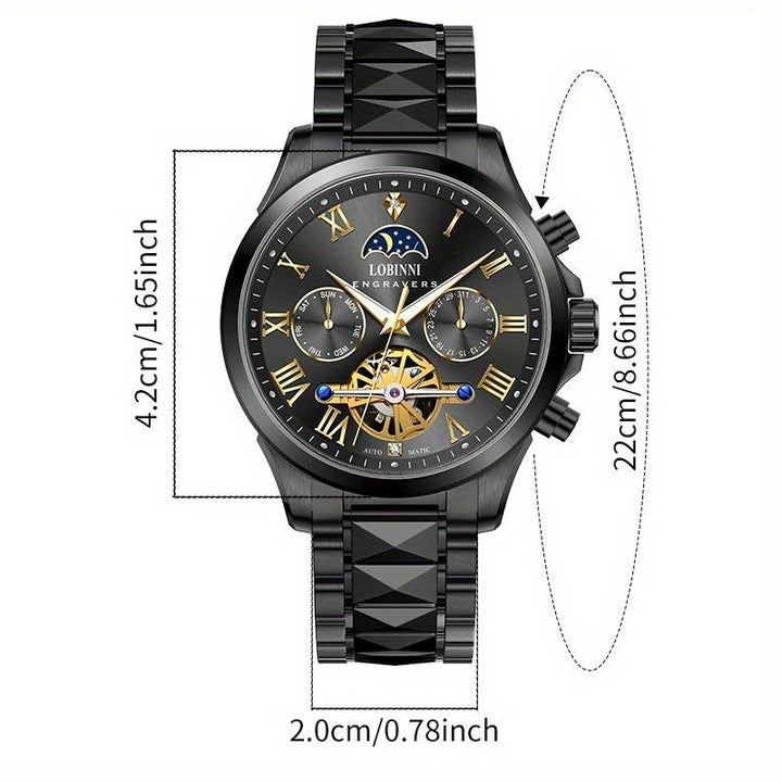 LOBINNI Men's Tourbillon Movement Fully Automatic Mechanical Watch, Mechanical Watch with Month, Day and Week Display 19051