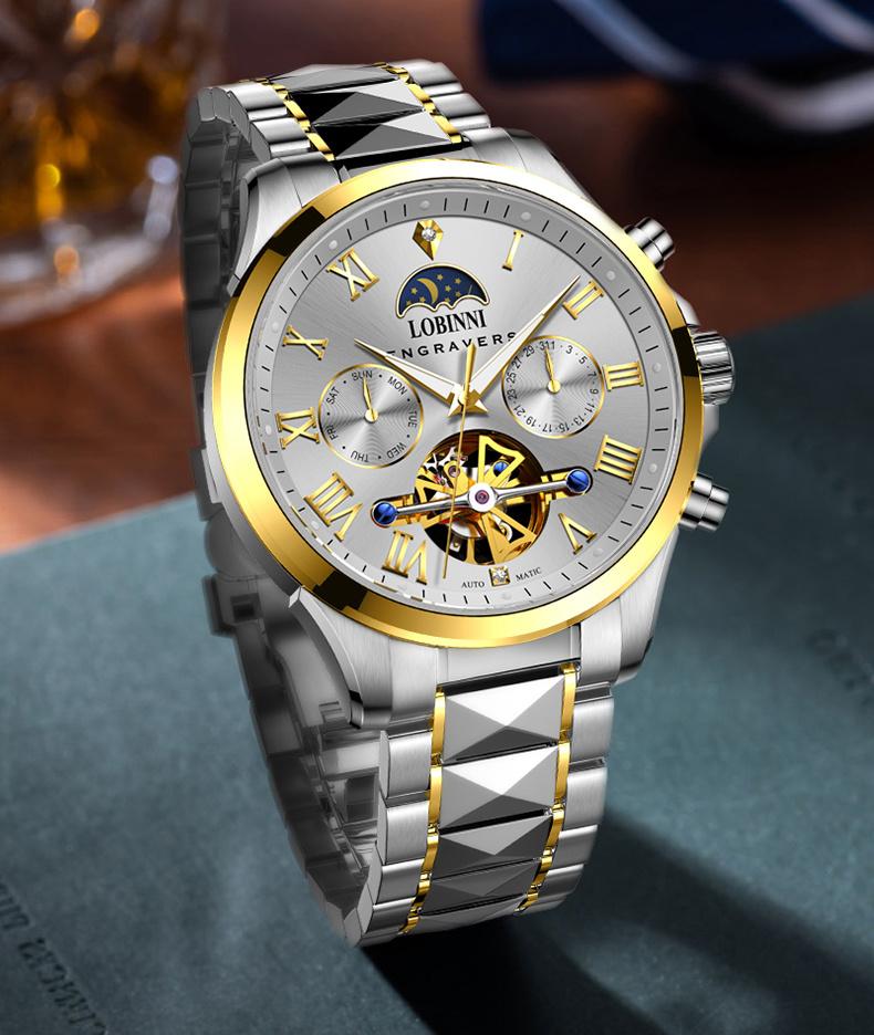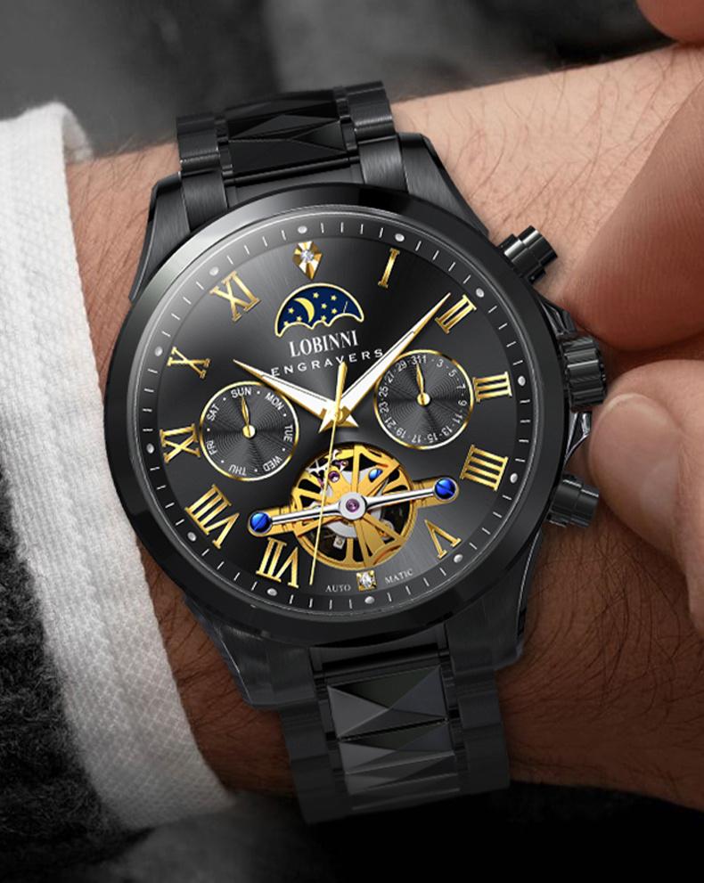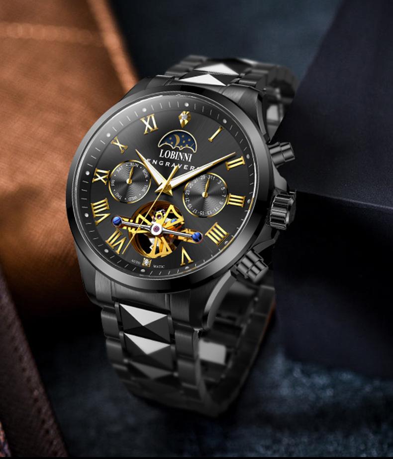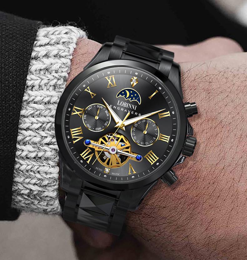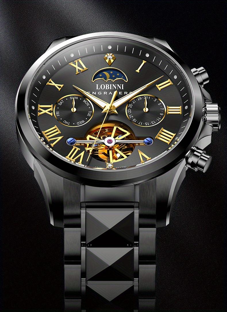 LOBINNI Men's Tourbillon Movement Fully Automatic Mechanical Watch, Mechanical Watch with Month, Day and Week Display19051