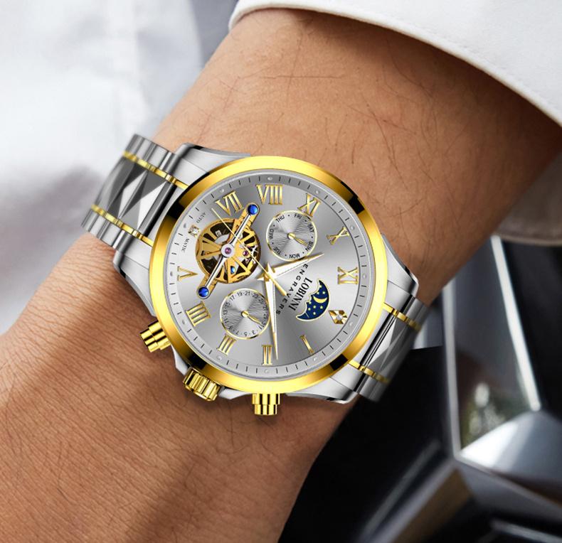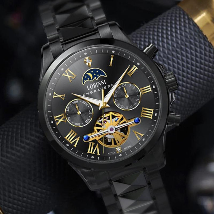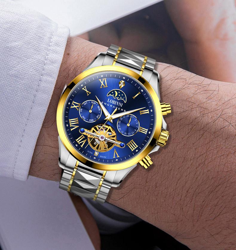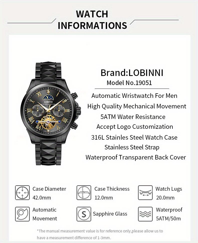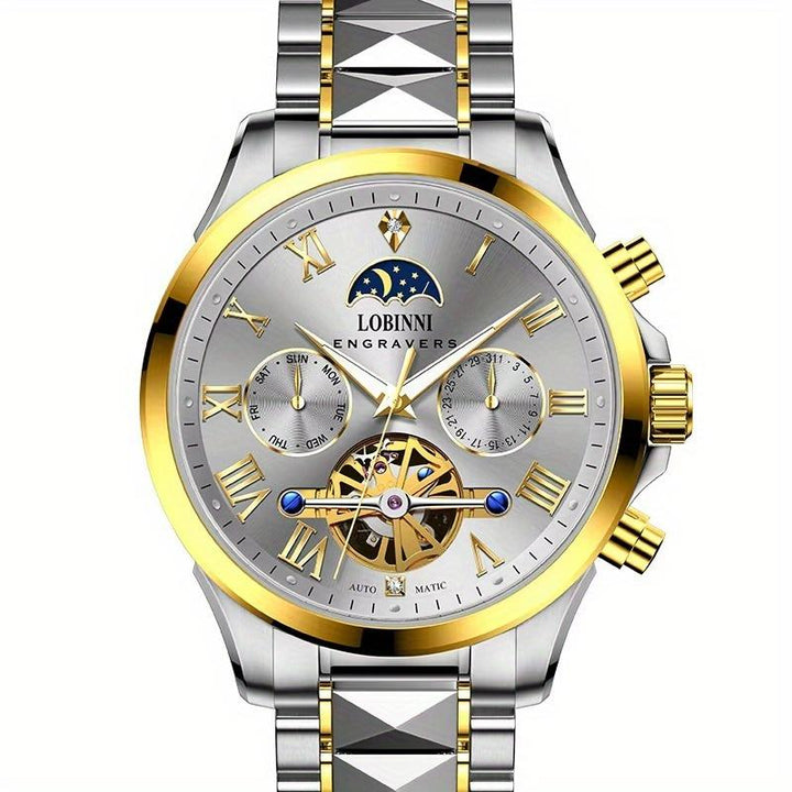 LOBINNI Men's Tourbillon Movement Fully Automatic Mechanical Watch, Mechanical Watch with Month, Day and Week Display19051