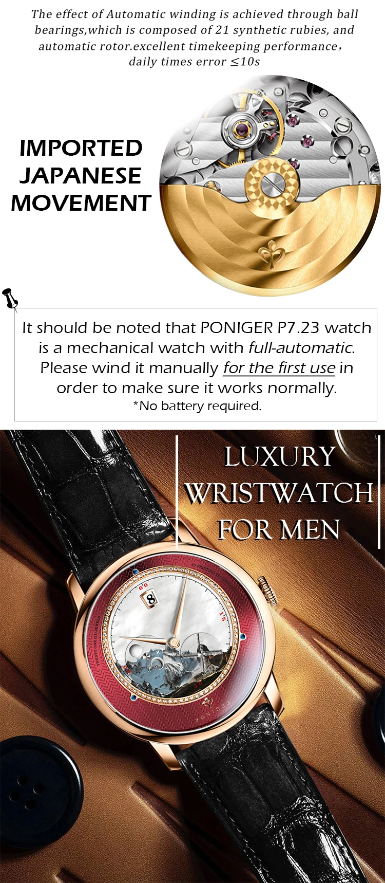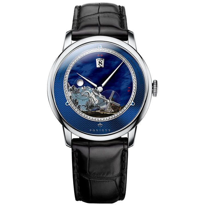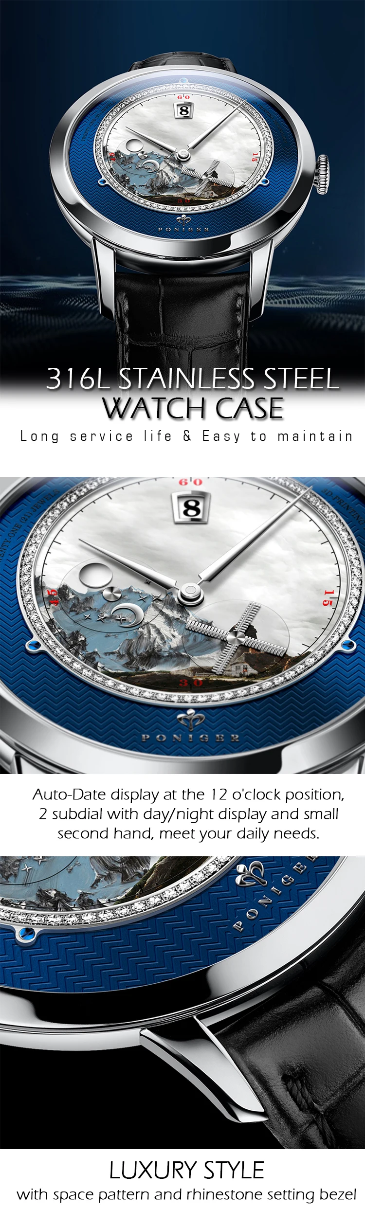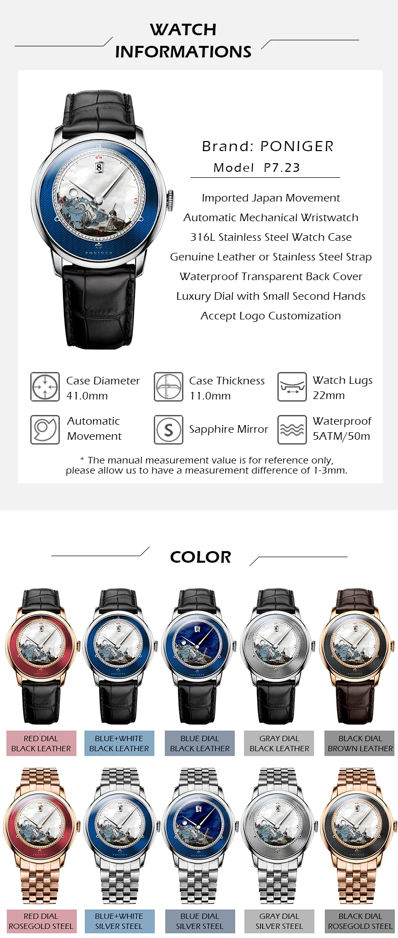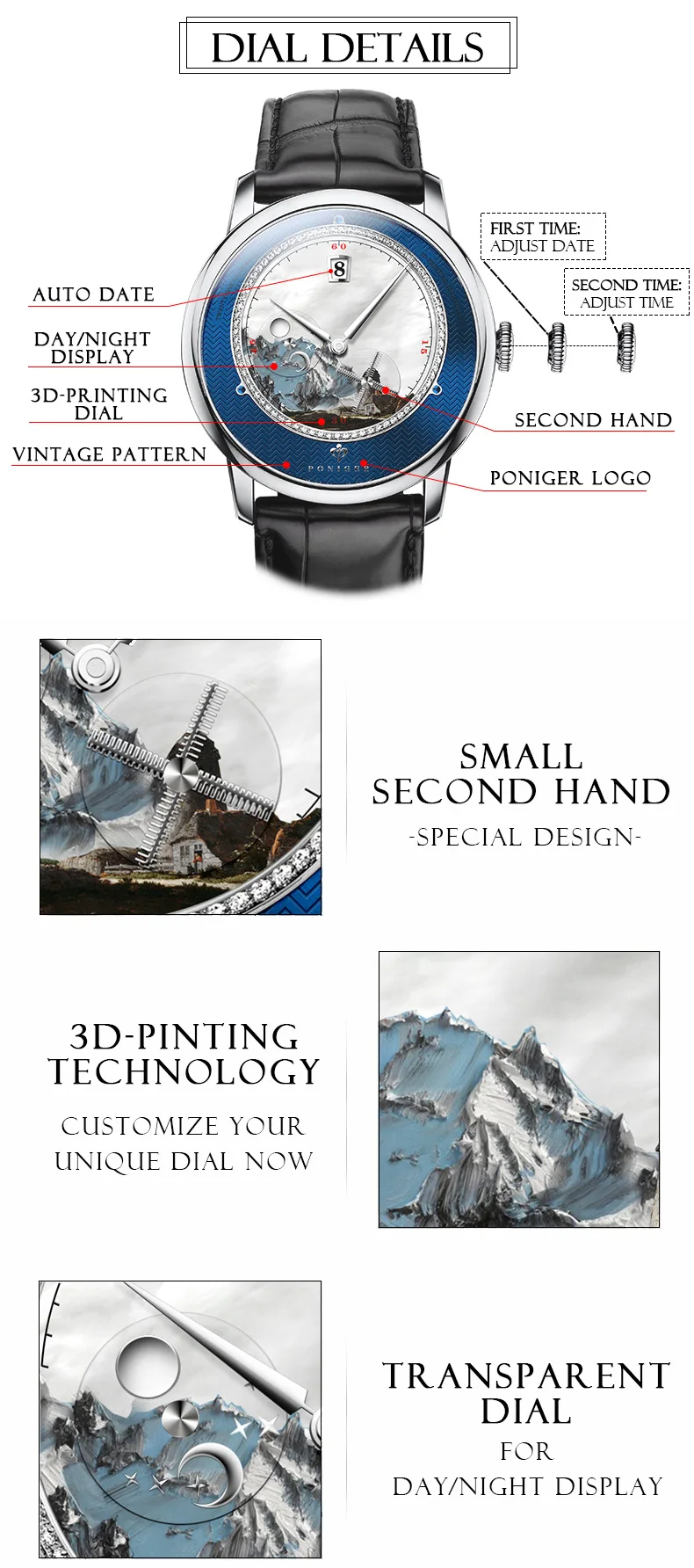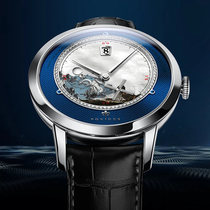 PONIGER代加工手表机械自有品牌定制表盘蓝色彩色男士真皮腕表relogio男士