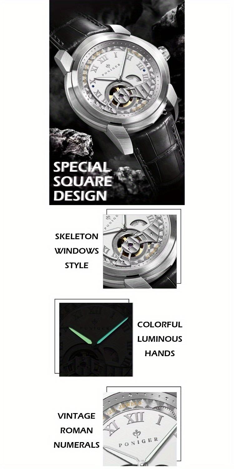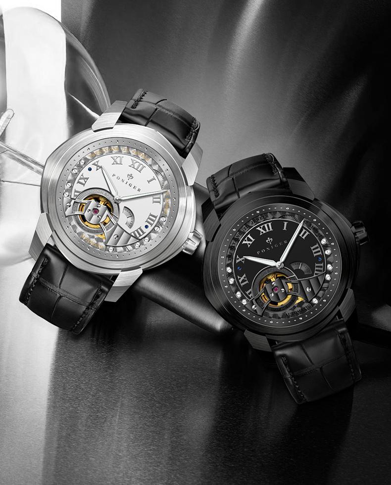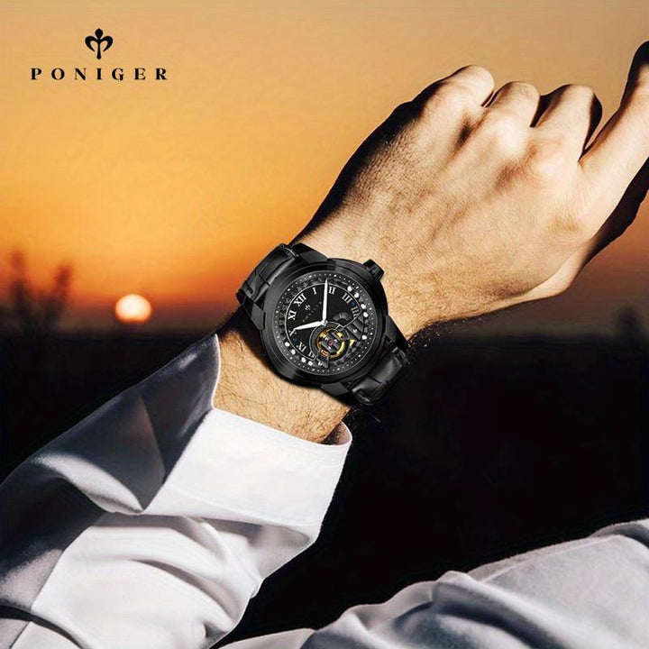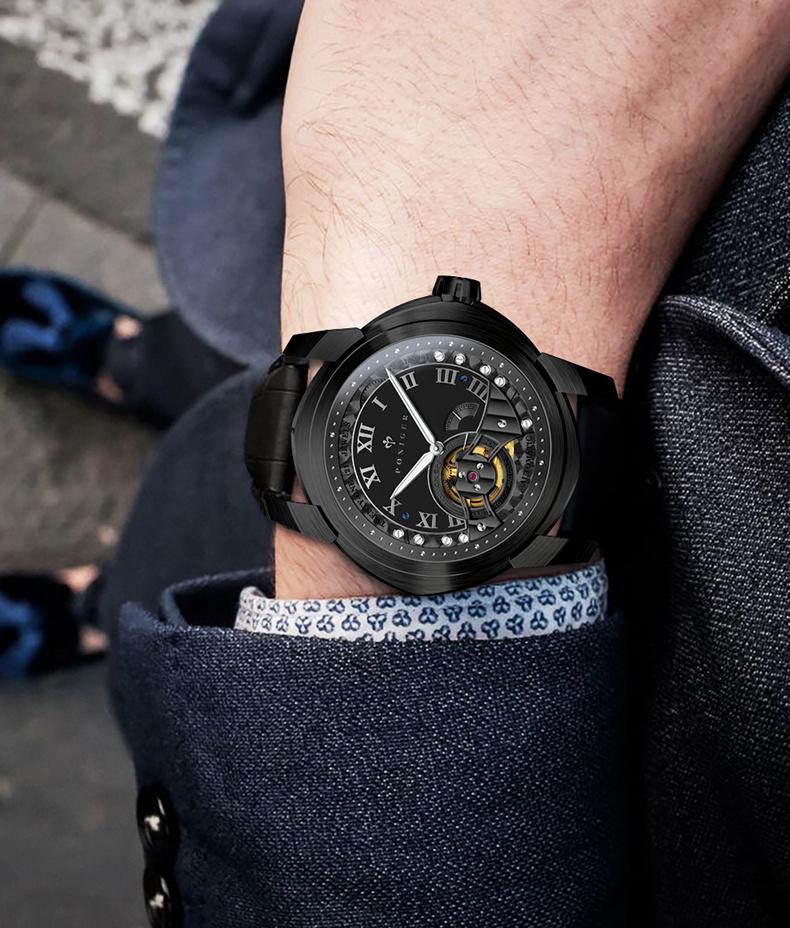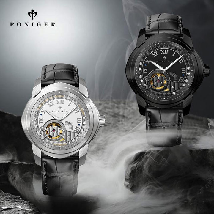 Poniger Skull Black Watch Men's Luxury Erkek Kol Saati Men's Watch Japanese Movt Automatic Mechanical Hollow Watch