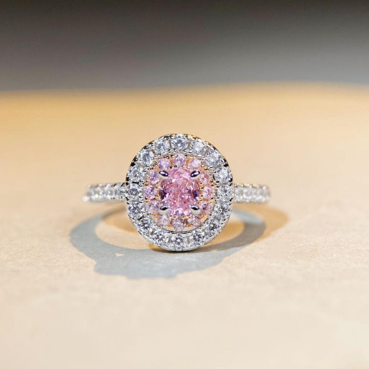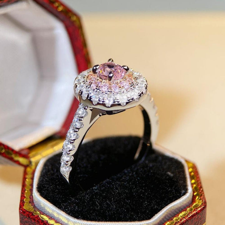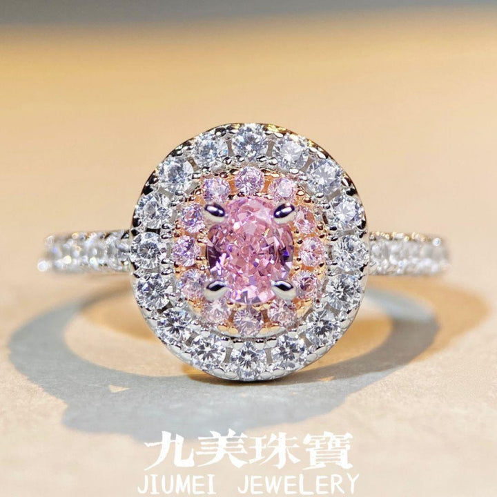 S925纯银粉钻戒指女简约时尚小鸽子蛋粉宝旦形钻戒满钻锆石戒子